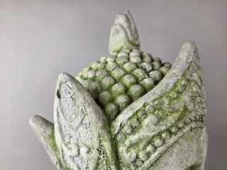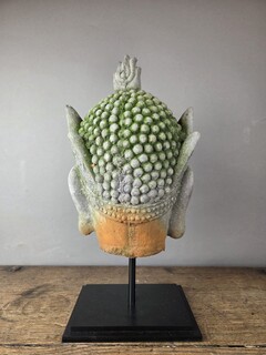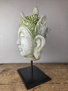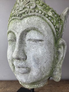 Reconstituted stone Buddha head, mounted on a base, early 20th century