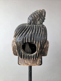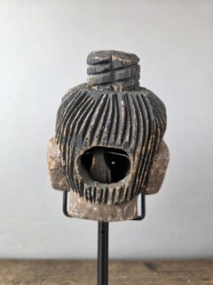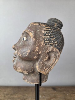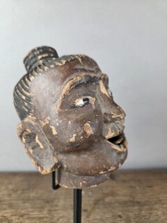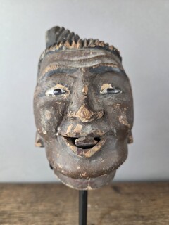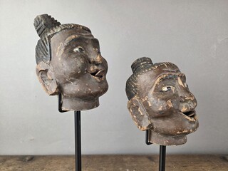Two carved wooden puppet heads on pedestals, Burma, late 19th century. Articulated tongue. 750 euros each.