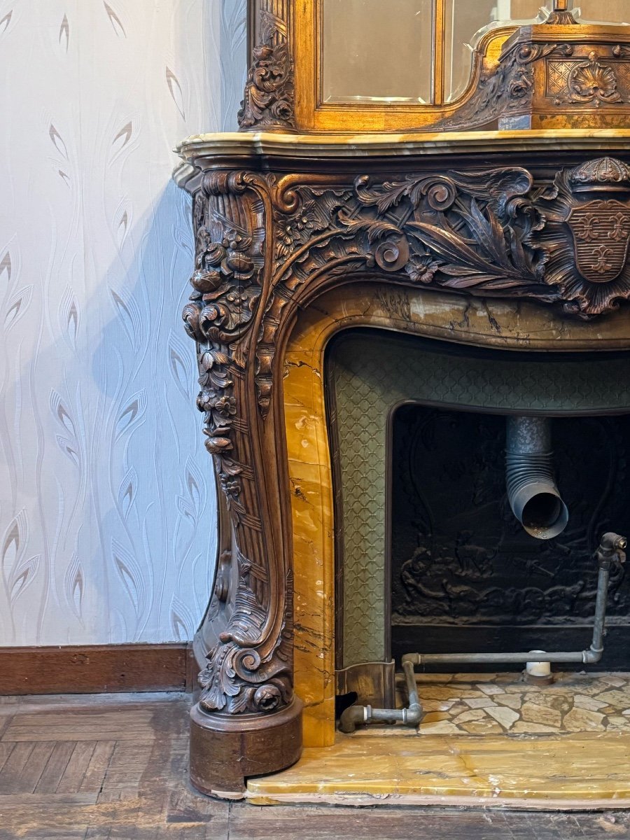 Impressive fireplace and its richly carved wooden trumeau highlighted with yellow Siena marble, circa 1900