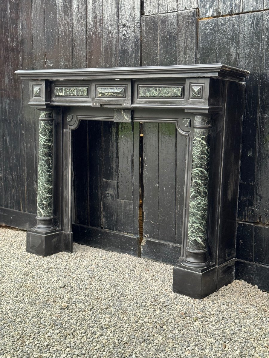Napoleon III fireplace in antique Belgian black and green marble, circa 1880 restored shelf on top, see photo dimensions of the hearth: 99 x 96 cm