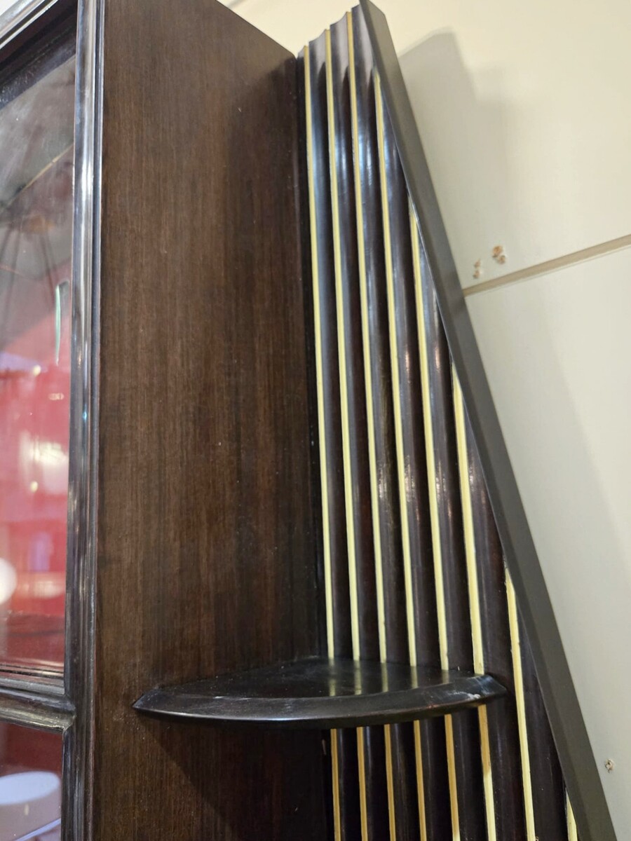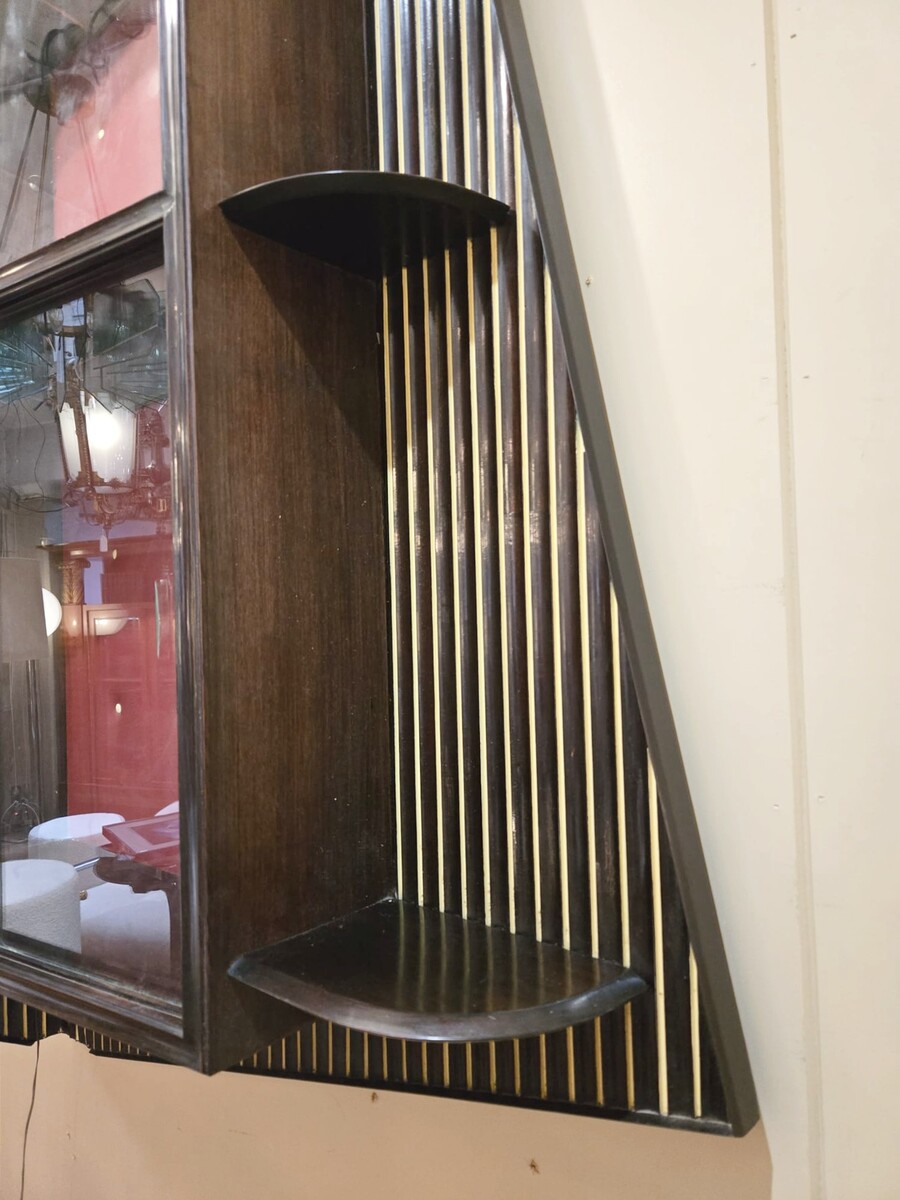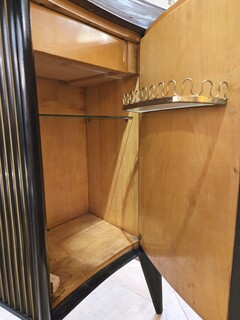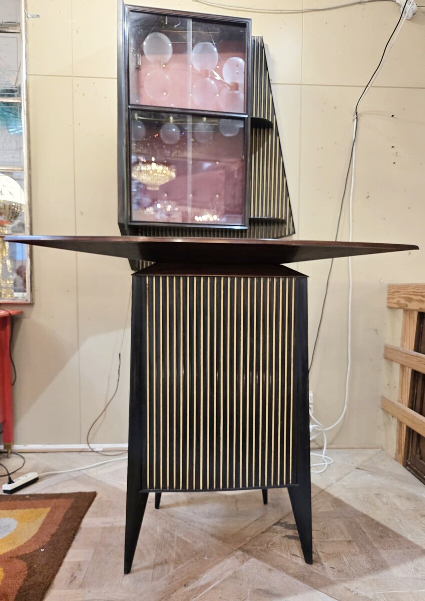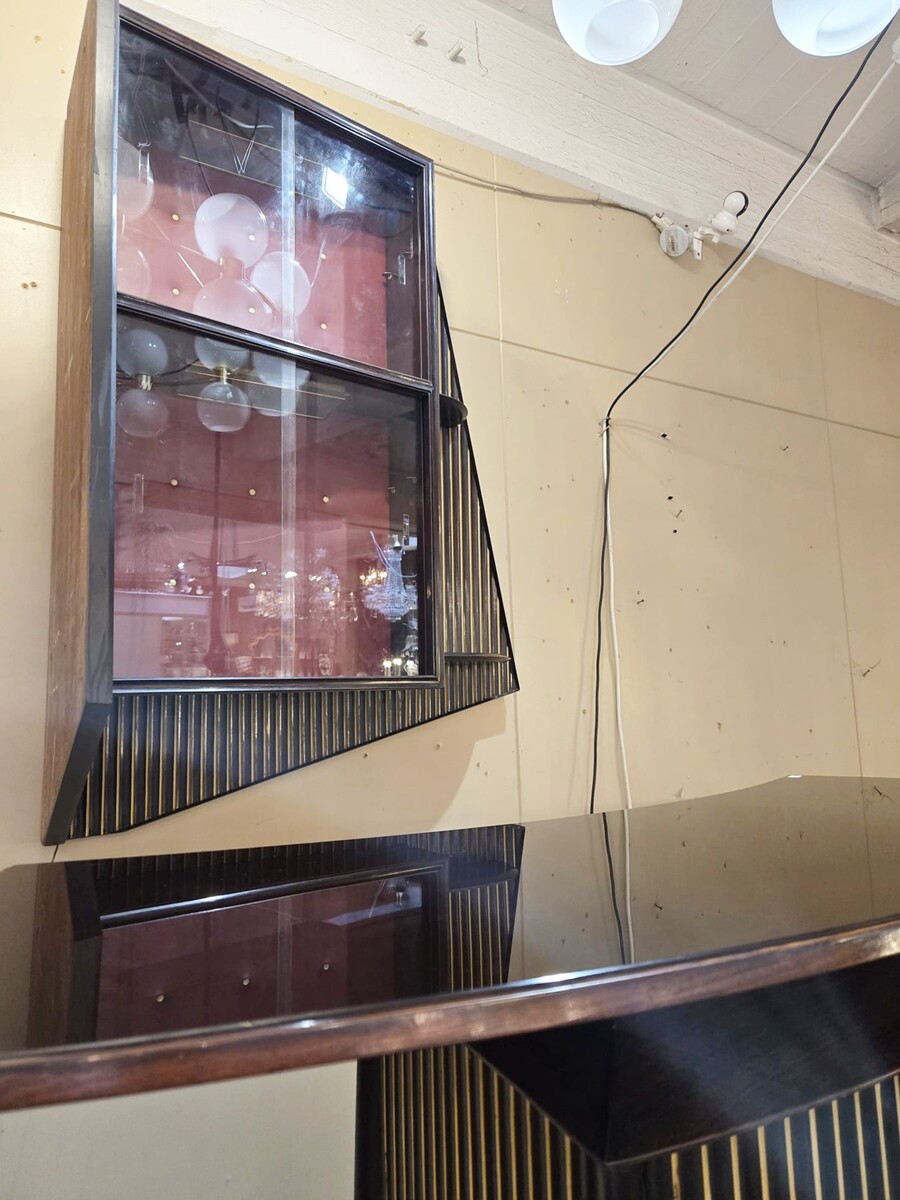 Italian wood and glass bar console, 1950s, attributed to Cappelletti, Camagni e Porro. The console bar measures 110 cm high, 135 cm long, and 40 cm deep. The matching glass structure measures 120 cm high, 90 cm wide, and 43 cm deep.