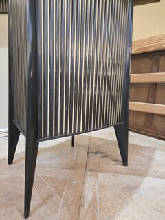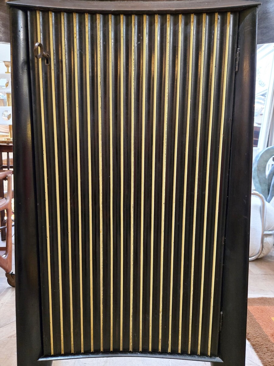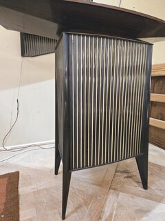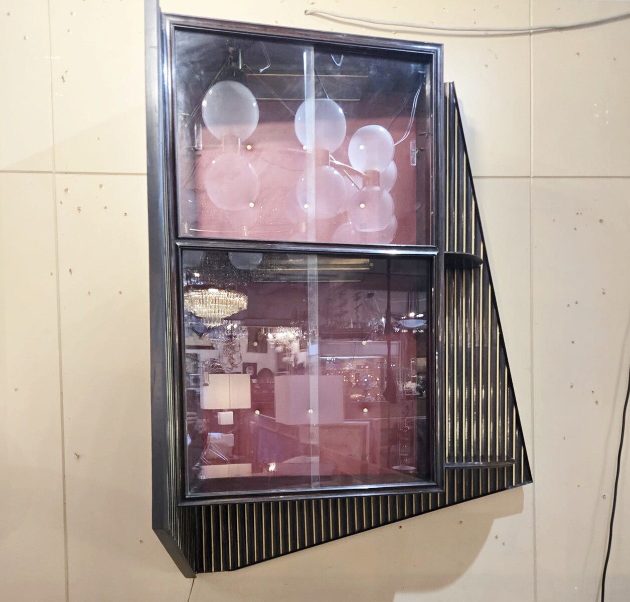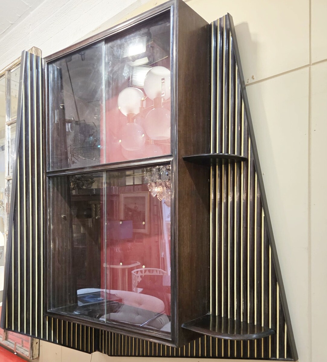 Italian wood and glass bar console, 1950s, attributed to Cappelletti, Camagni e Porro. The console bar measures 110 cm high, 135 cm long, and 40 cm deep. The matching glass structure measures 120 cm high, 90 cm wide, and 43 cm deep.