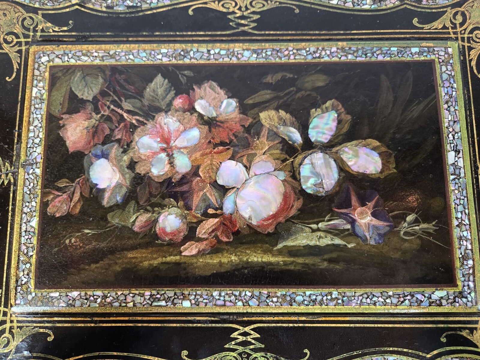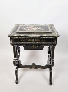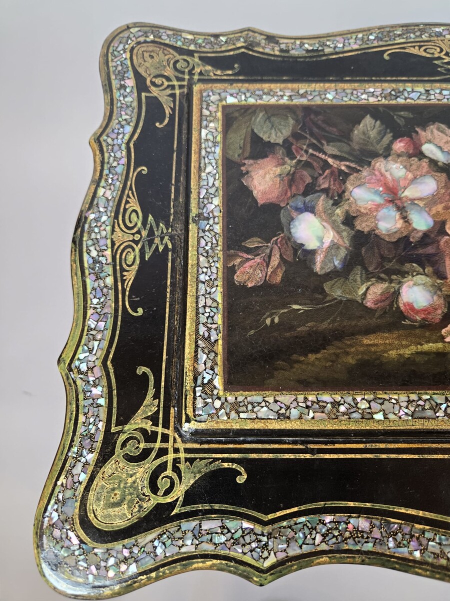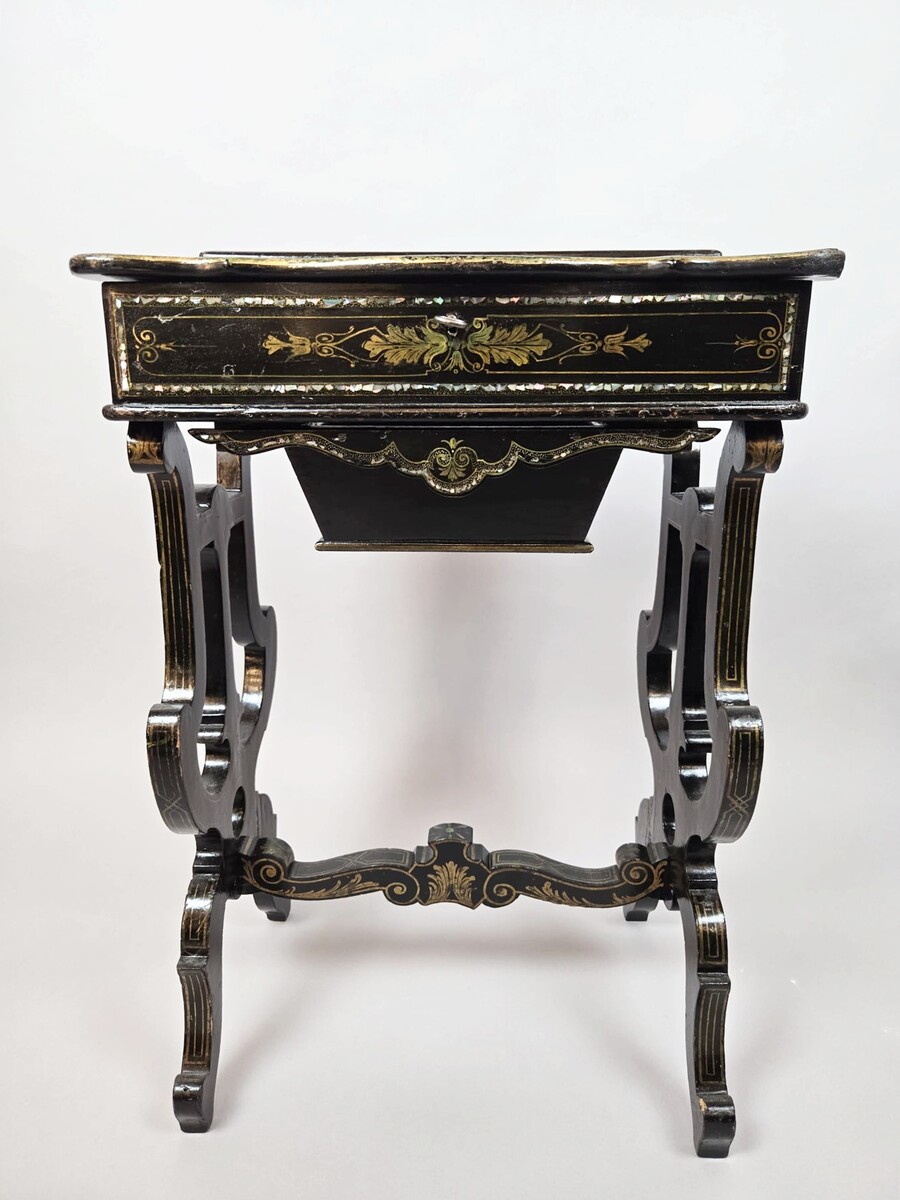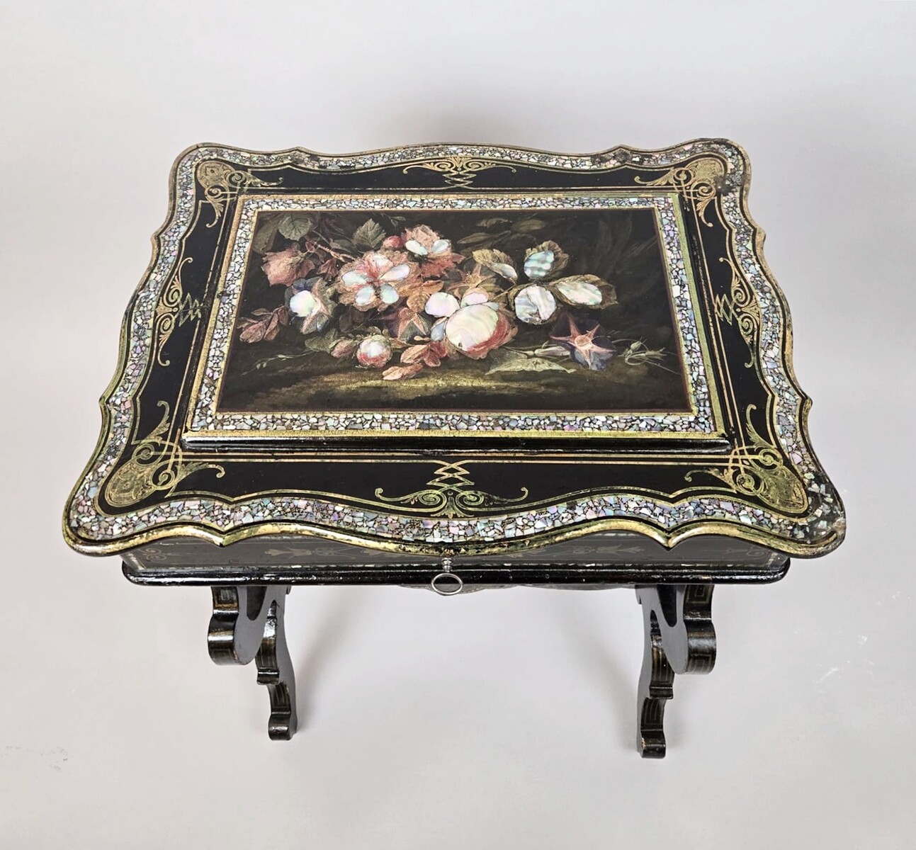 Napoleon III period sewing table in painted papier-mâché, floral decoration in a cartouche inlaid with mother-of-pearl chips. Interior lined with velvet.