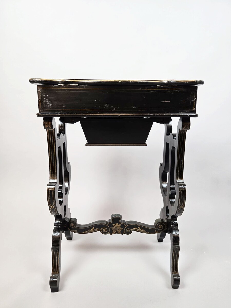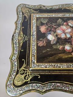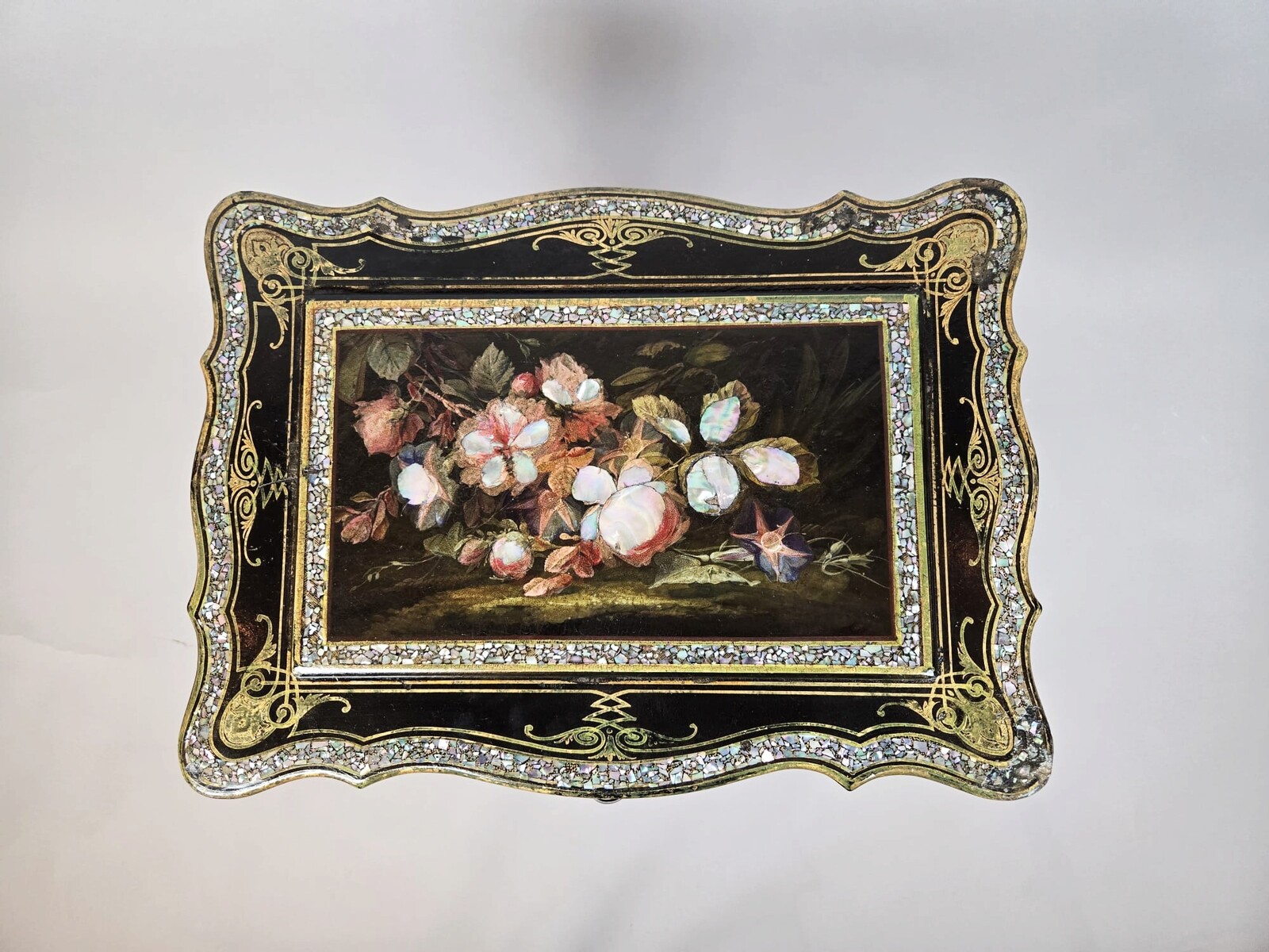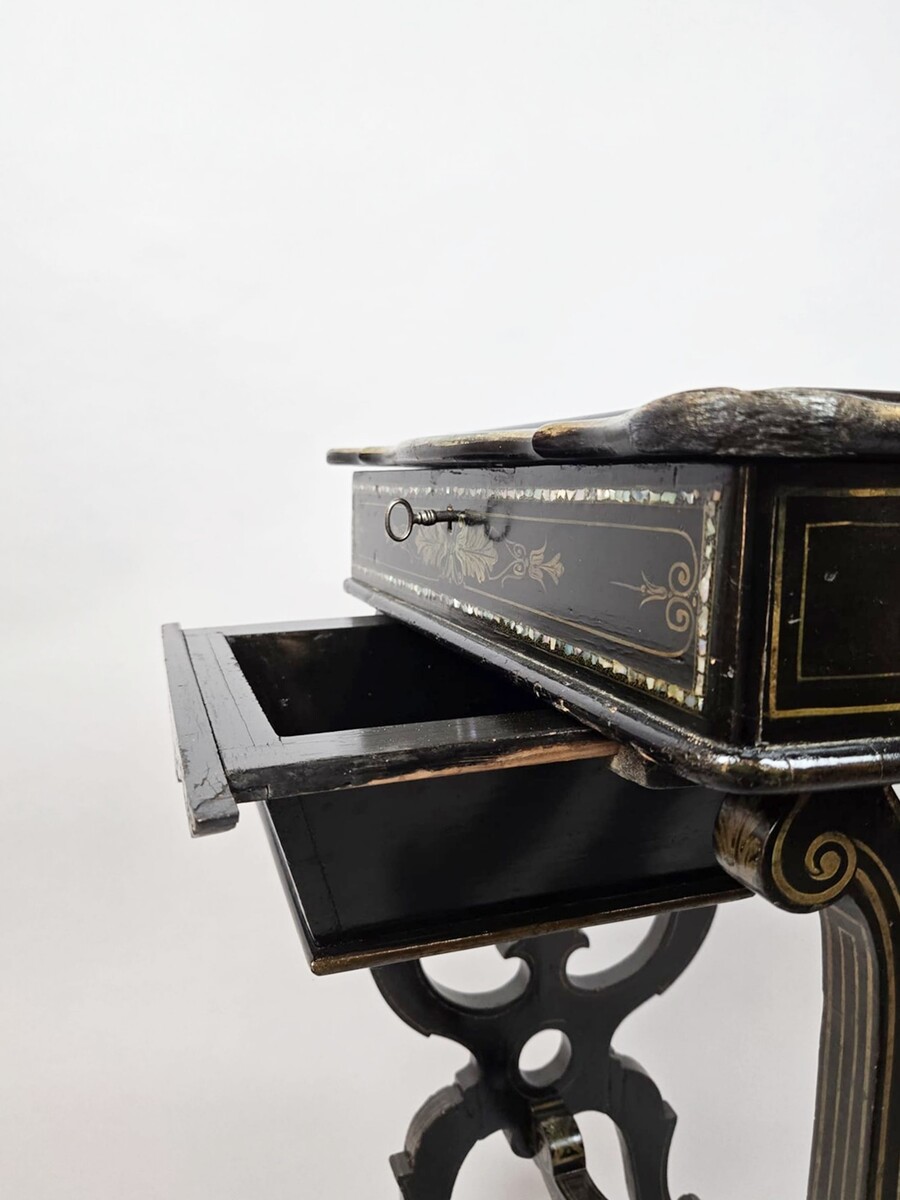 Napoleon III period sewing table in painted papier-mâché, floral decoration in a cartouche inlaid with mother-of-pearl chips. Interior lined with velvet.