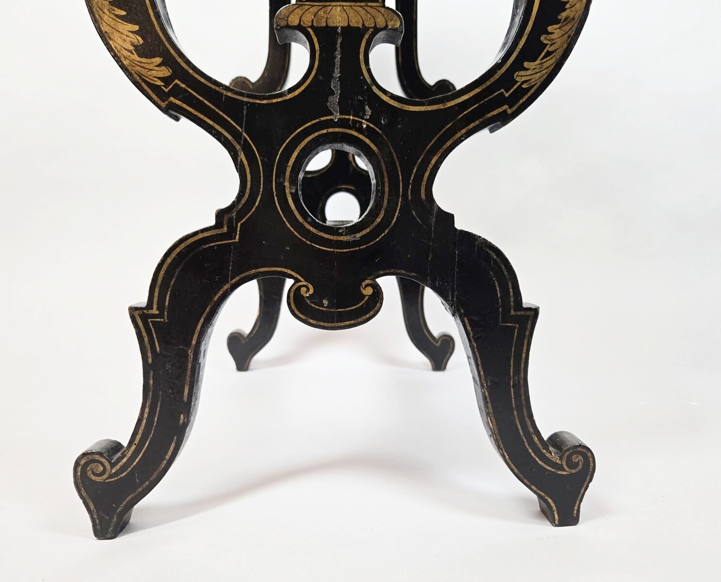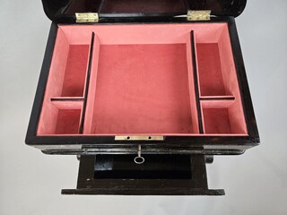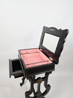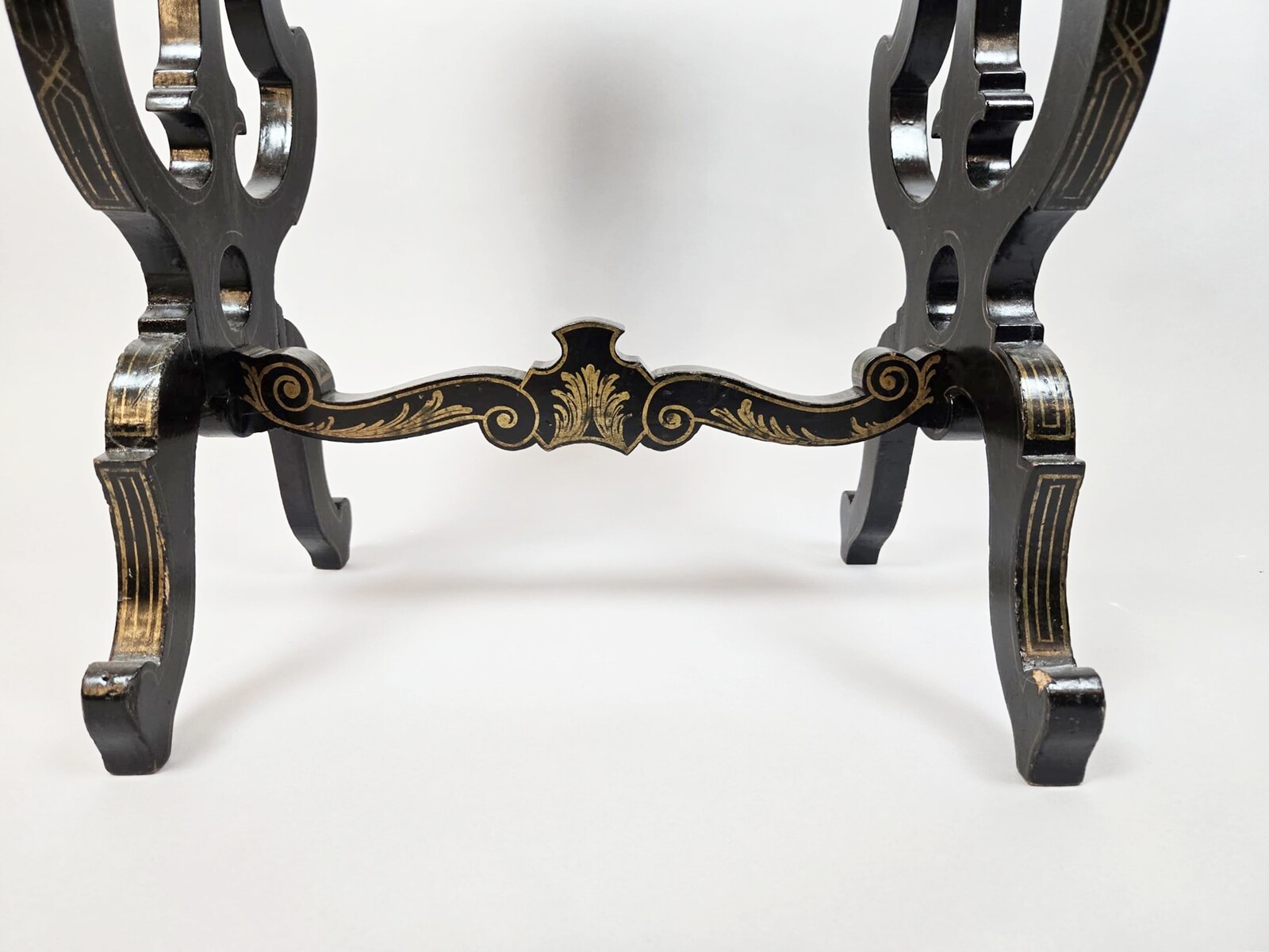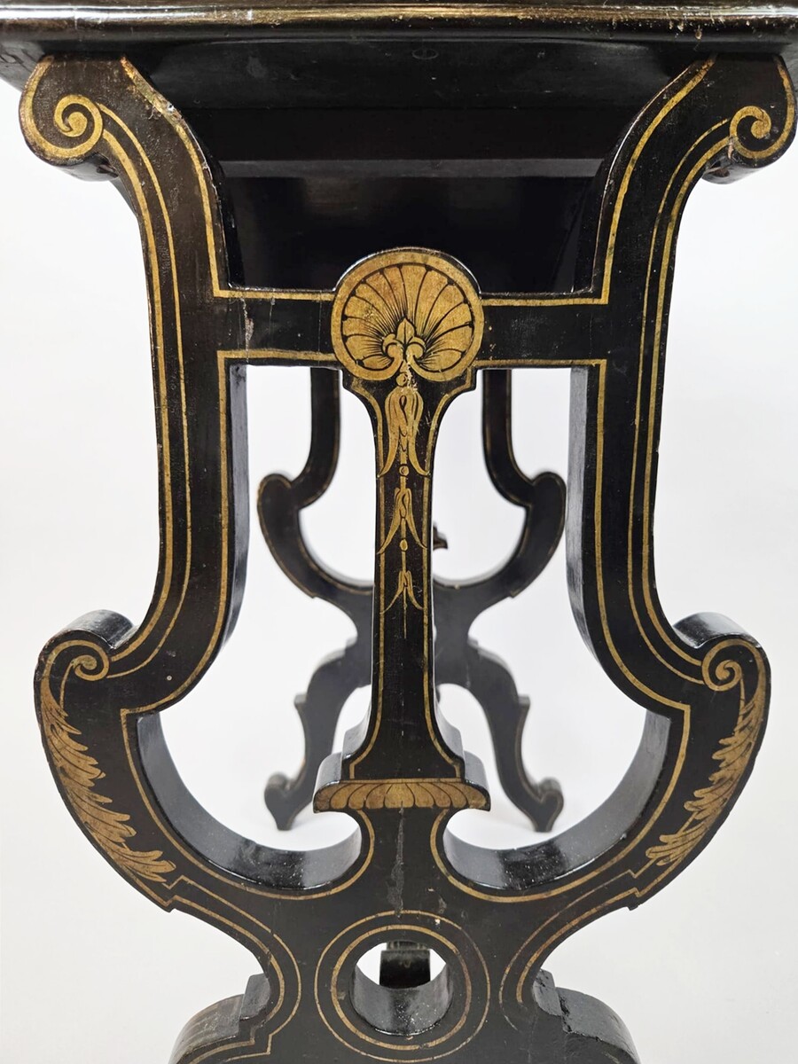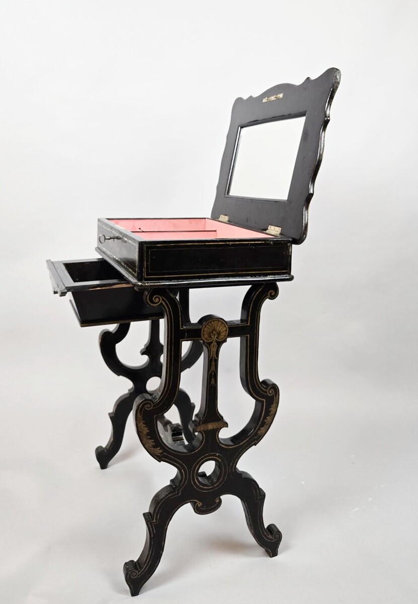 Napoleon III period sewing table in painted papier-mâché, floral decoration in a cartouche inlaid with mother-of-pearl chips. Interior lined with velvet.