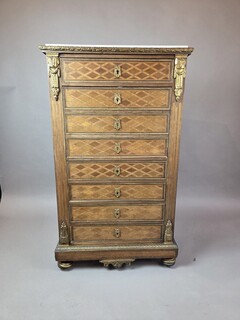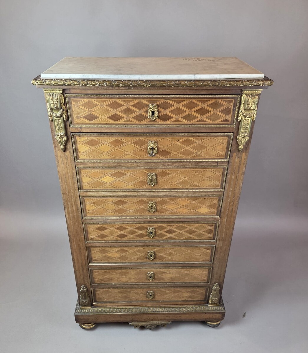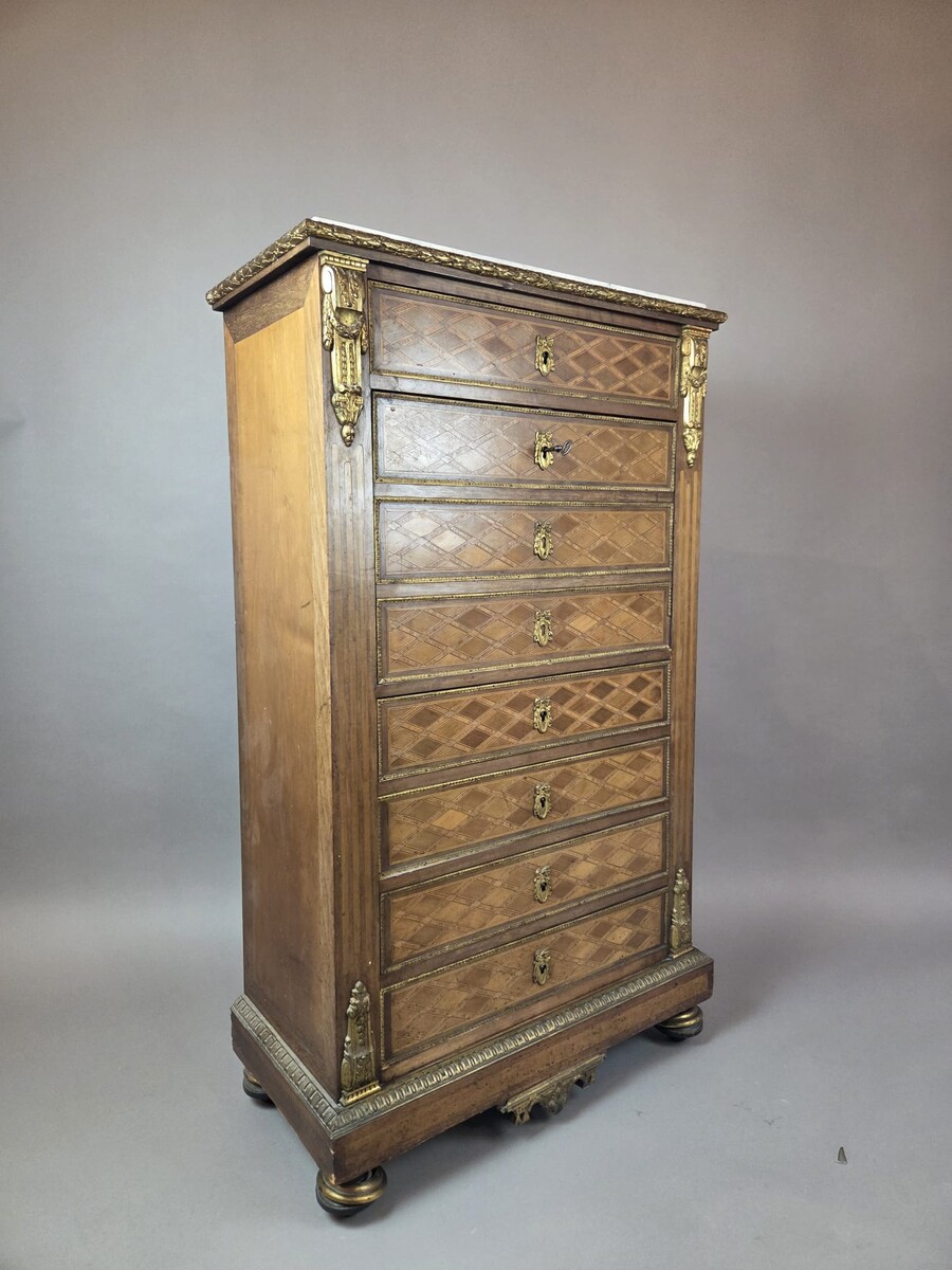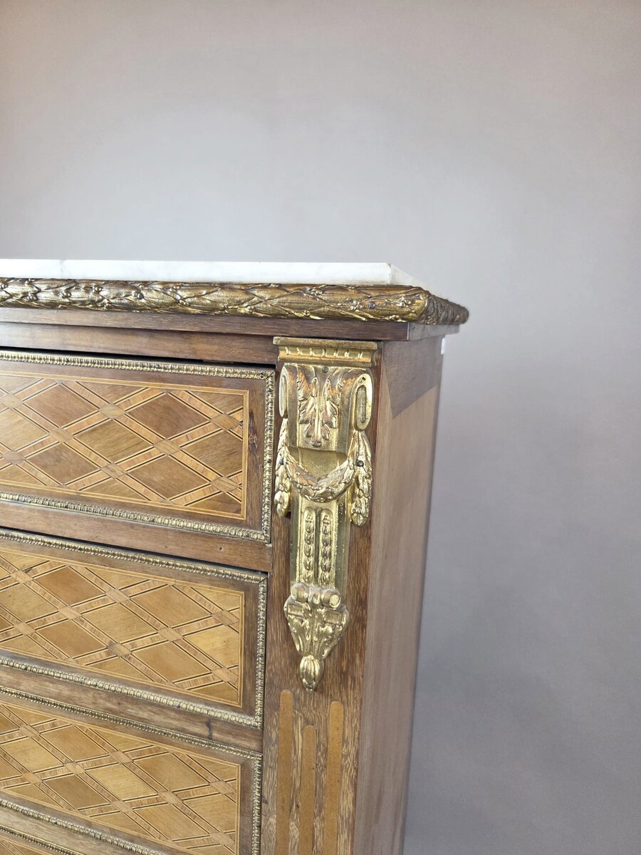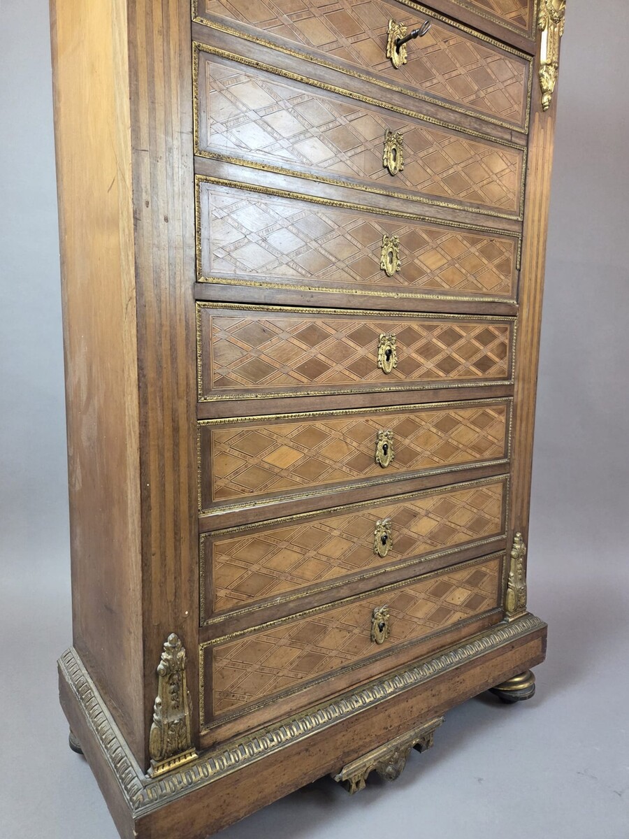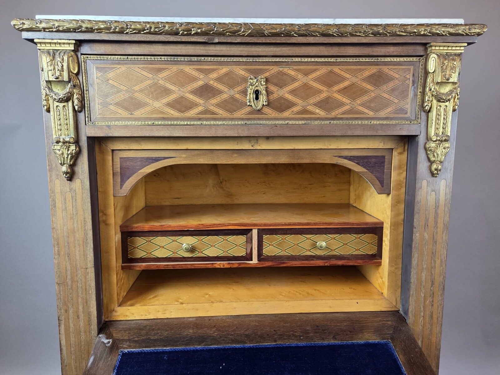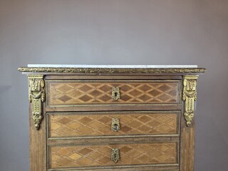 Louis XVI style secretary desk in marquetry wood and gilt bronze