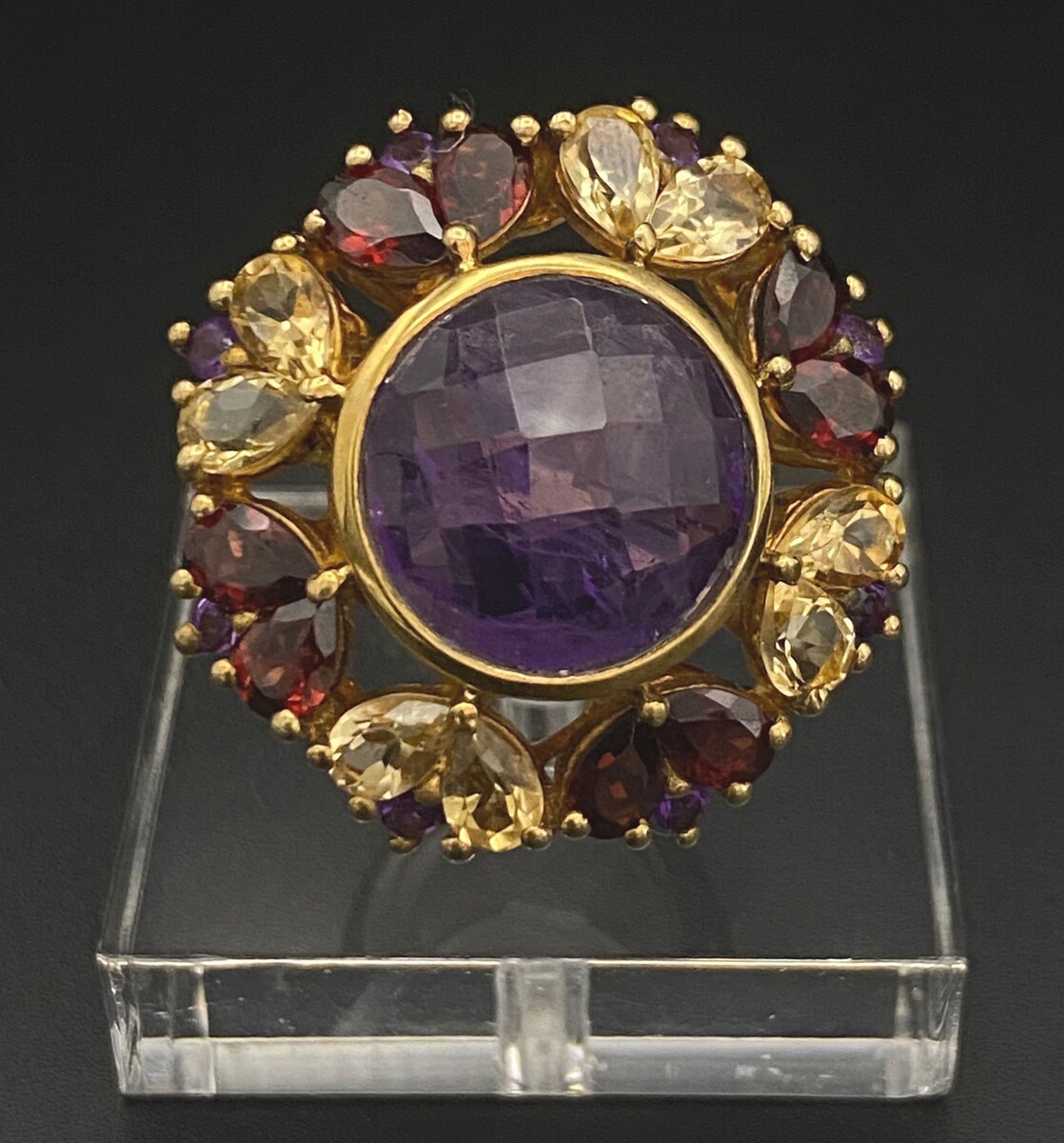 vermeil ring, central cabochon in cut amethyst, lined with garnets and citrines