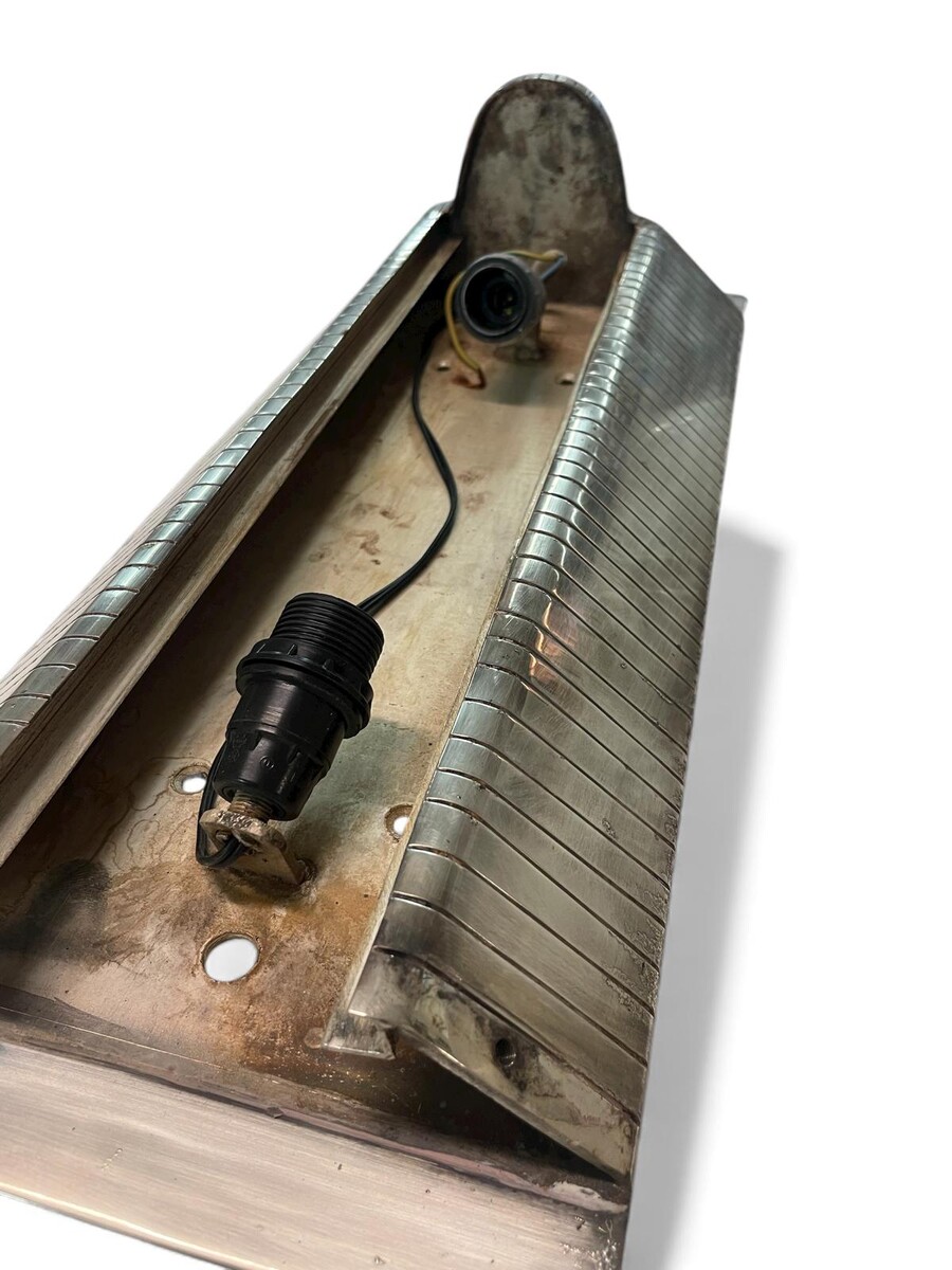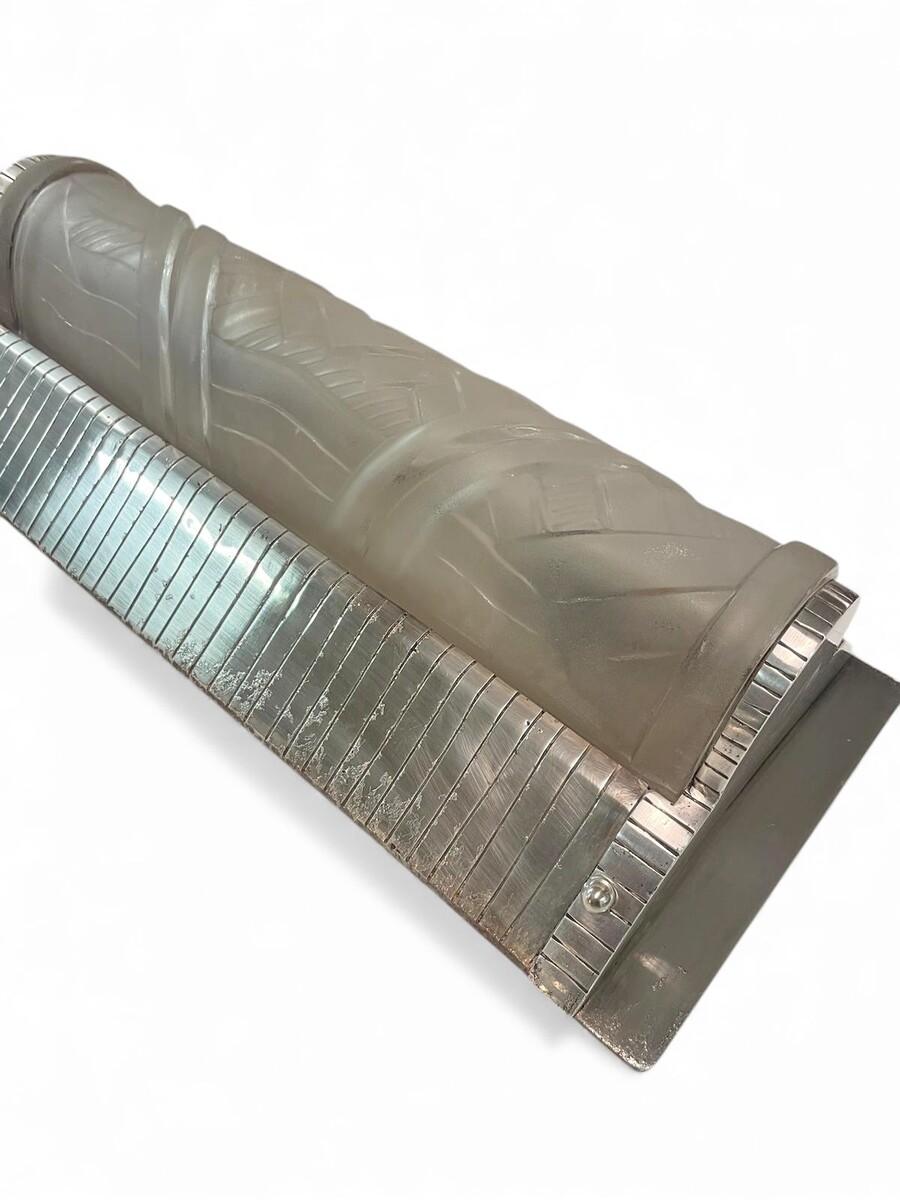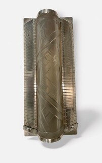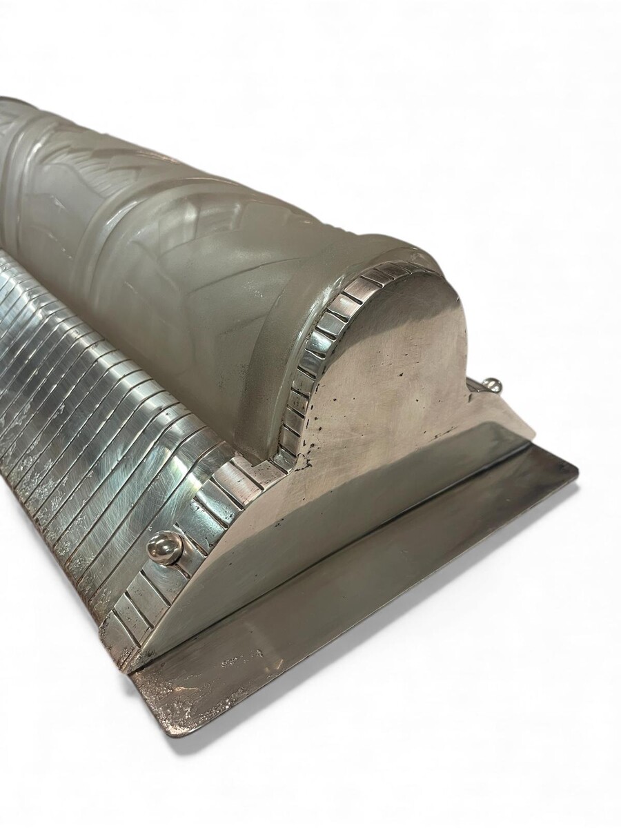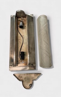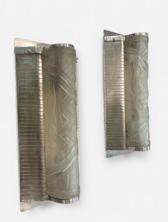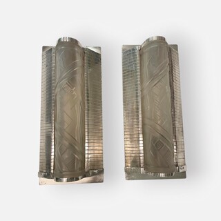 Pair of Art Deco wall sconces in silvered metal (slight pitting in some places) and sandblasted molded glass with geometric patterns.