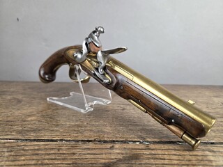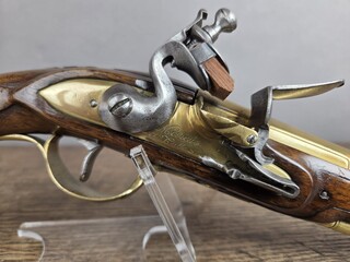 French naval officer's pistol, circa 1770, lock signed Marais à Tulle, line-marked brass fittings, screw-fastened and decorated hornbill cap, woodwork on rear of lock and breech, wood and brass ramrod, barrel with sights, excellent condition.