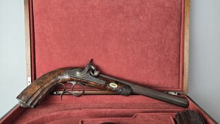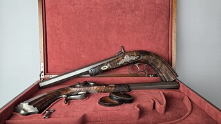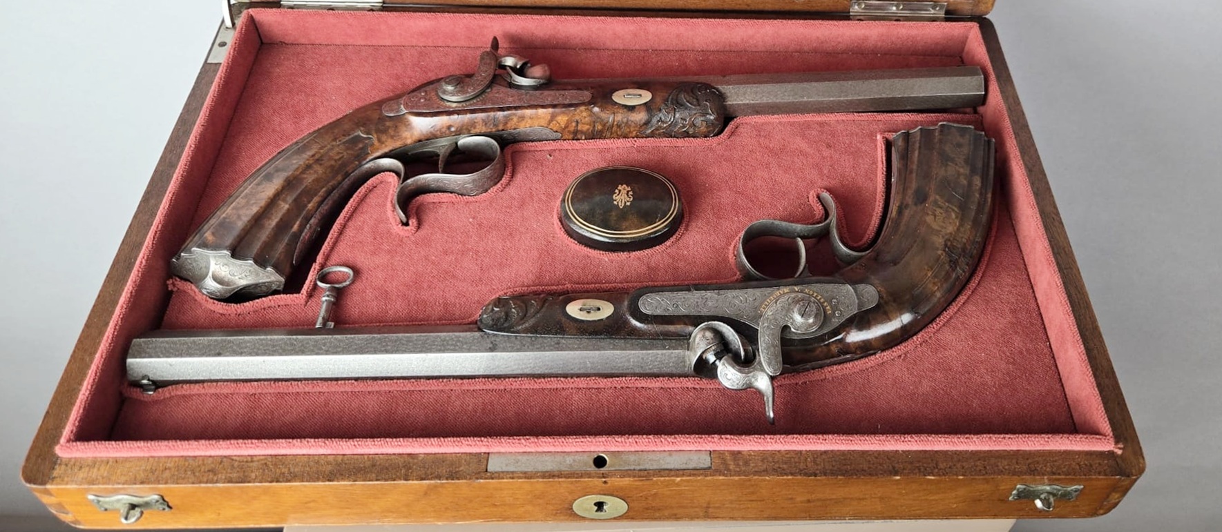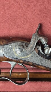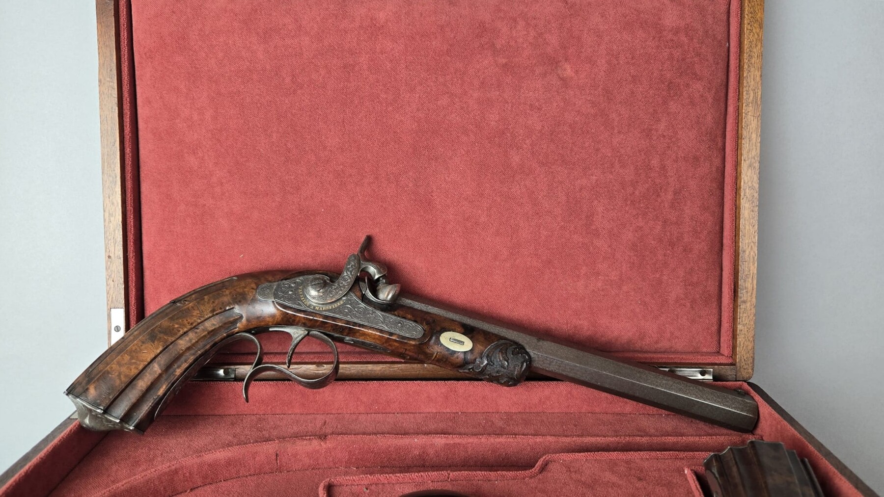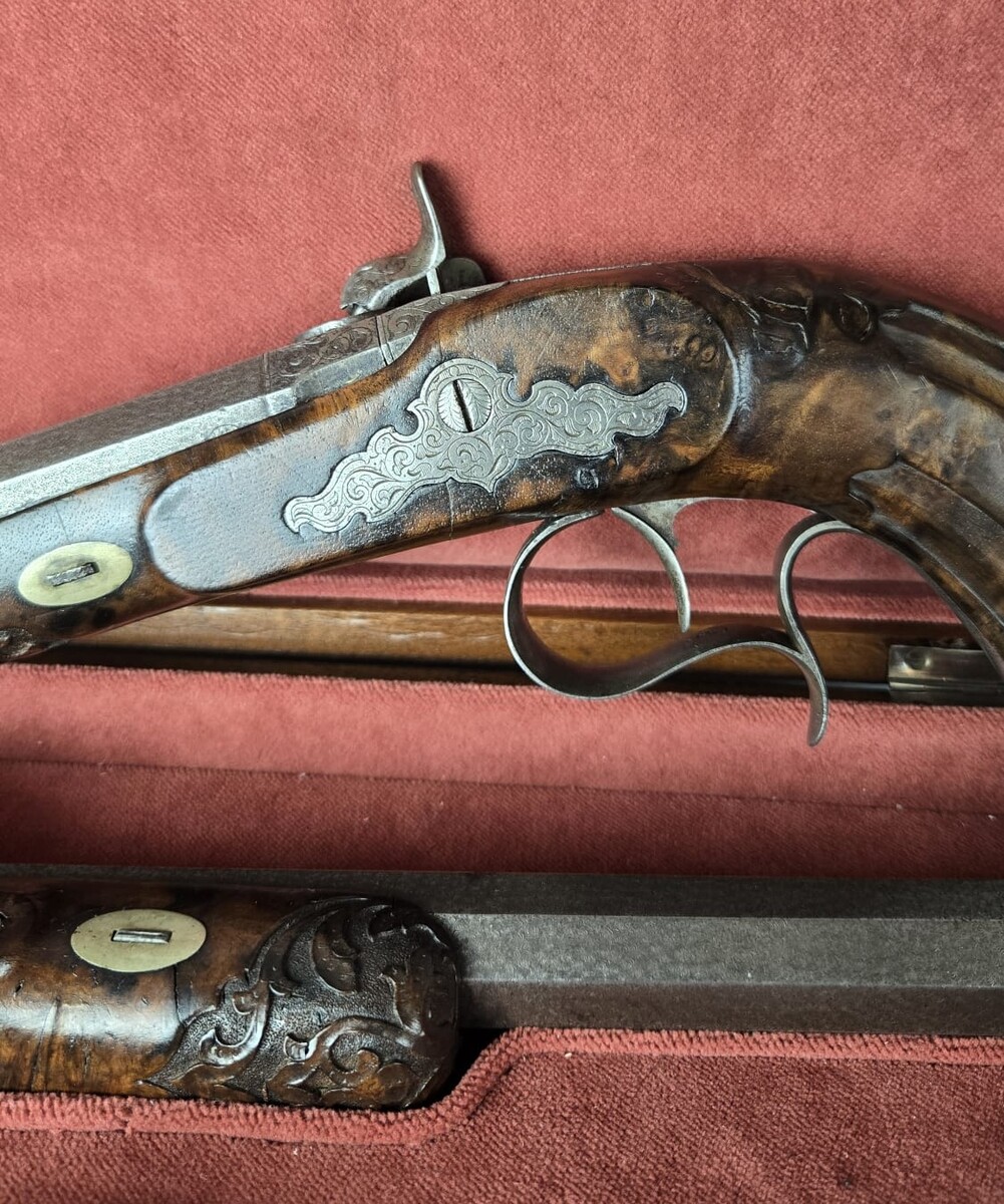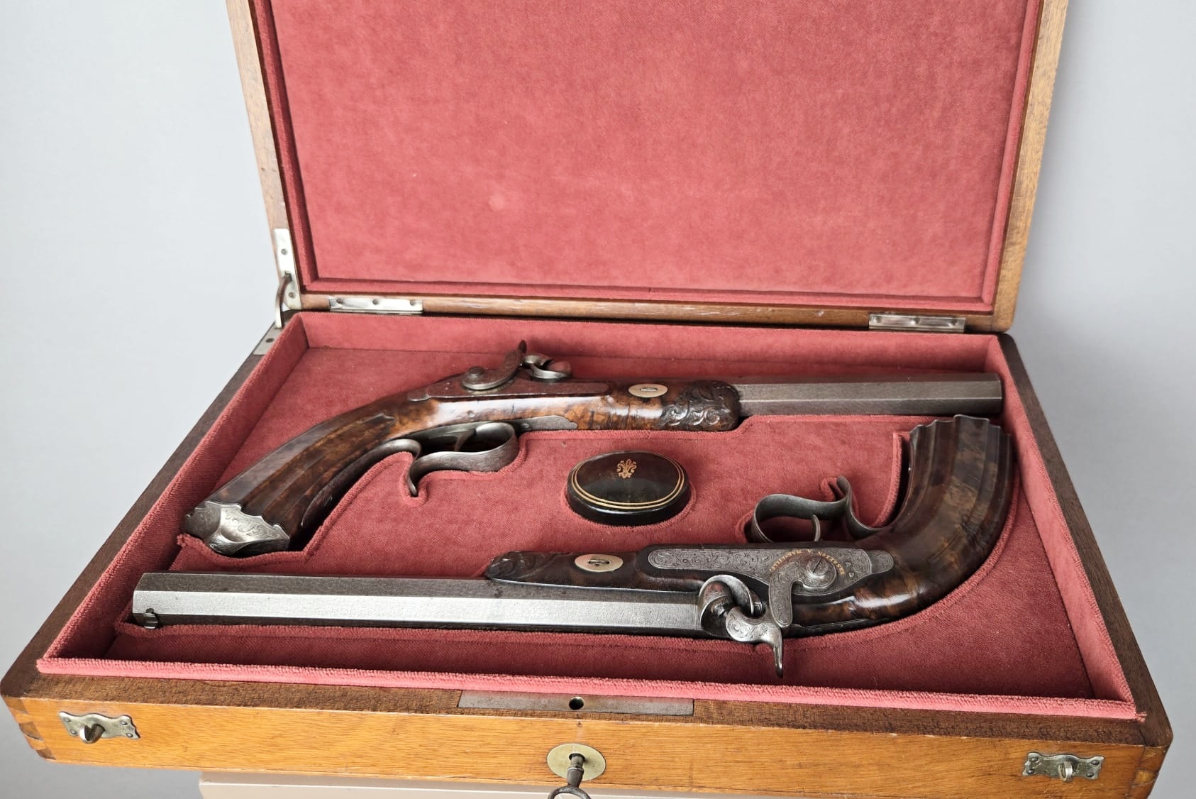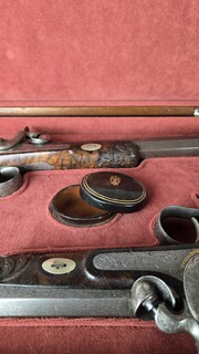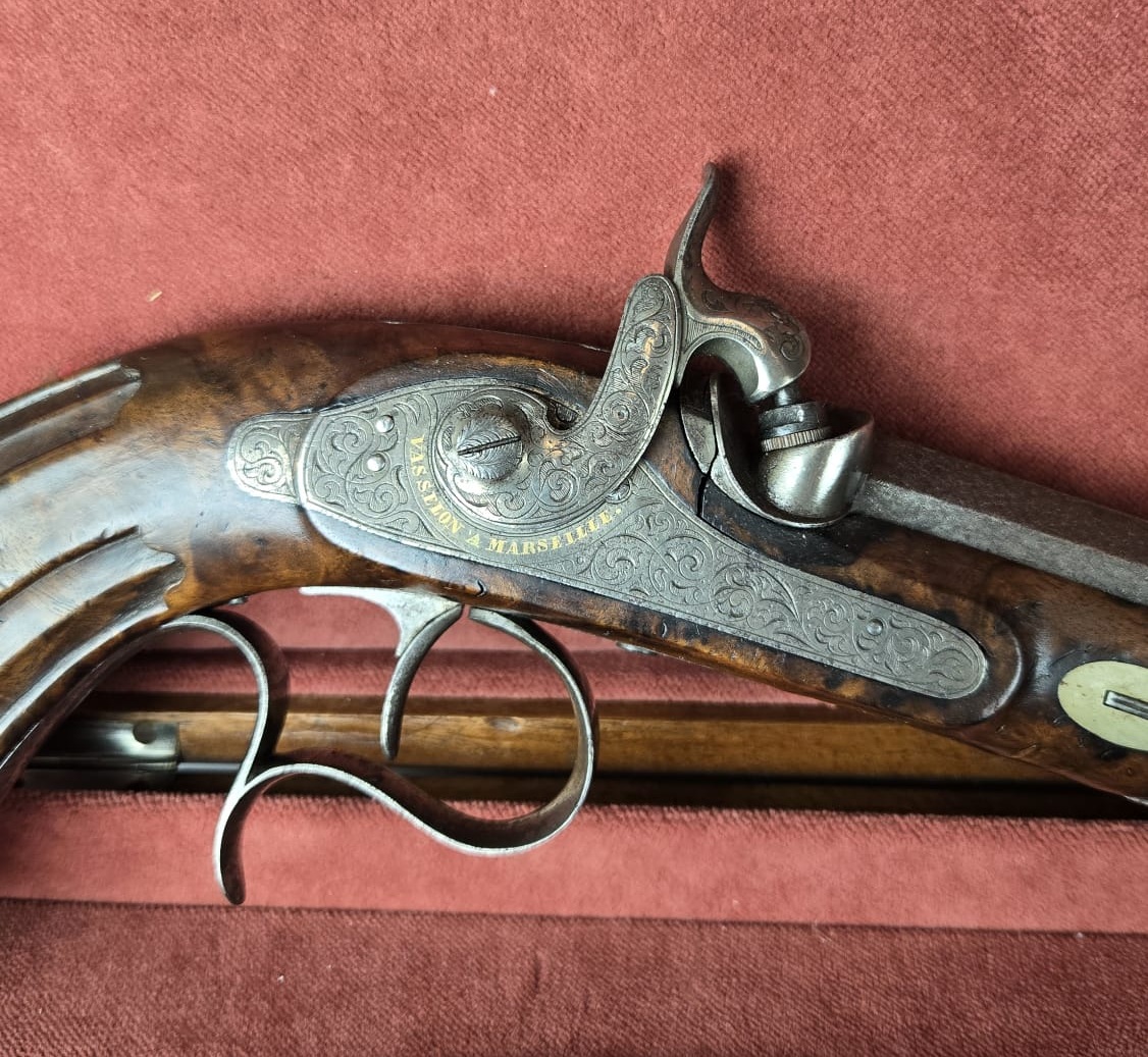 Pair of dueling pistols, France circa 1850, Regency style stocks. Engraved lock plate, side plate, breechblock, and hammer; gold markings on the barrel: 1 and 2 - Fine damascened barrel. On the lock plate: Vasselon à Marseille