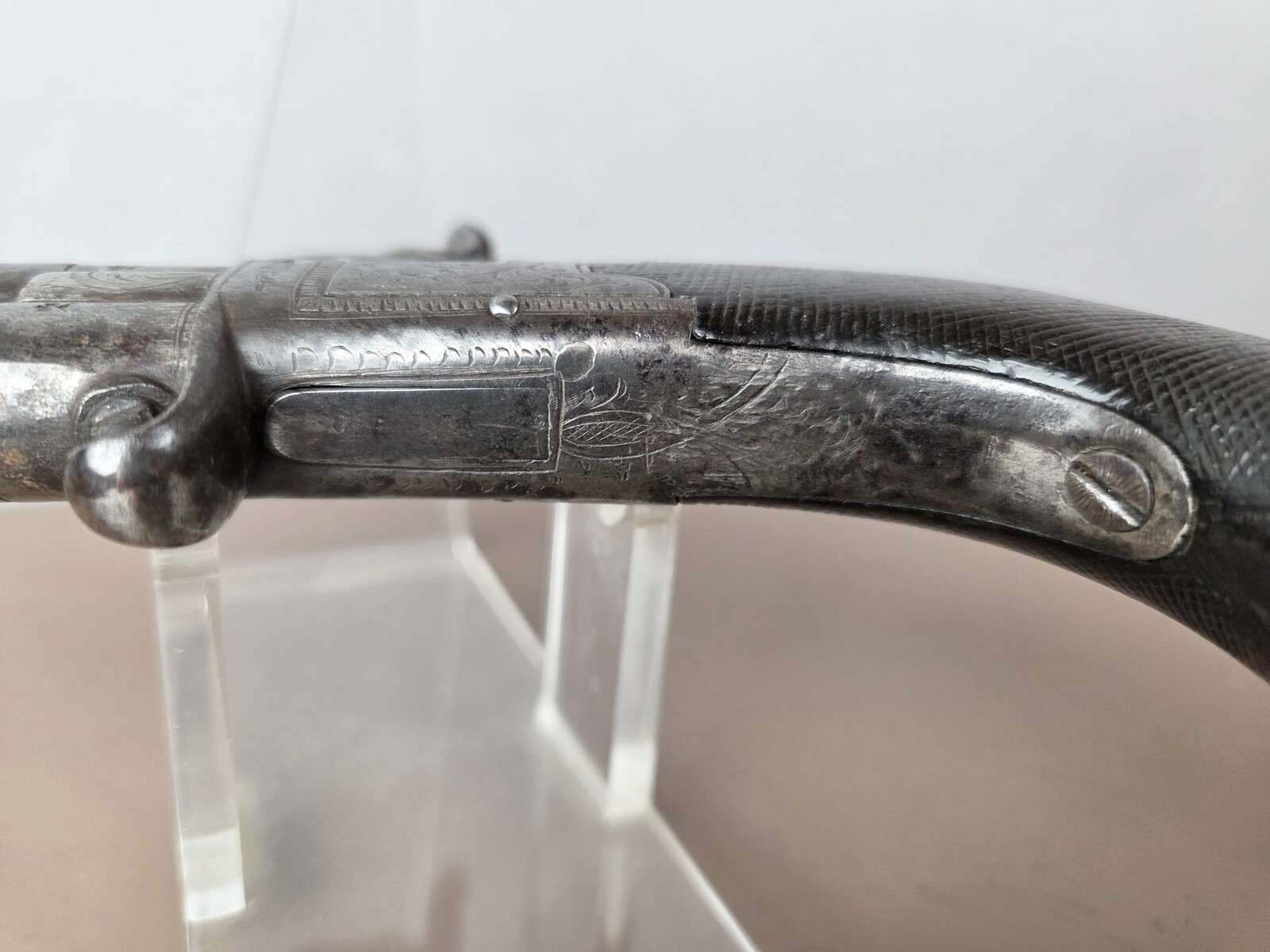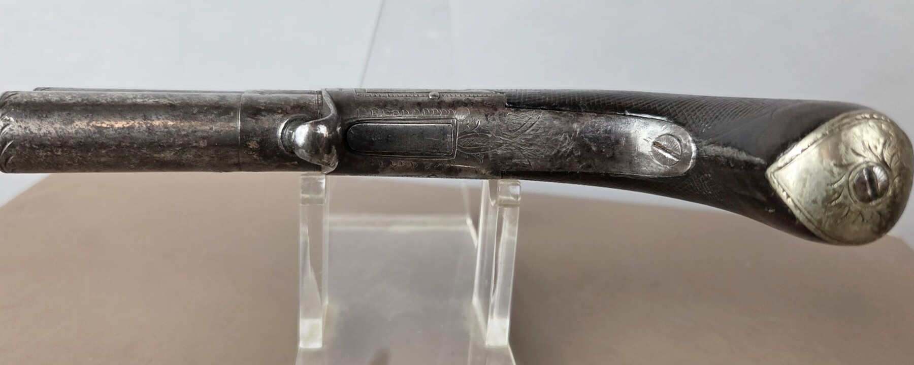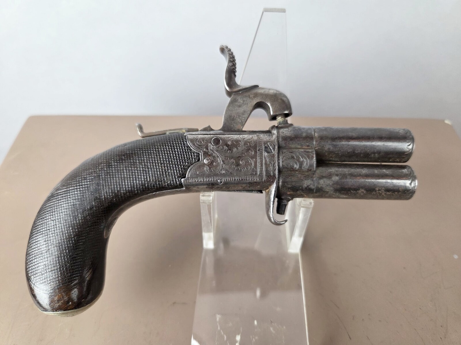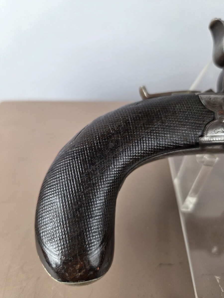 Percussion pistol with two superimposed barrels, England circa 1840, fine engravings