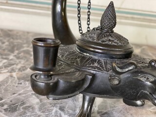 Bronze Inkwell On An Oil Lamp Model In The Taste Of The Antique